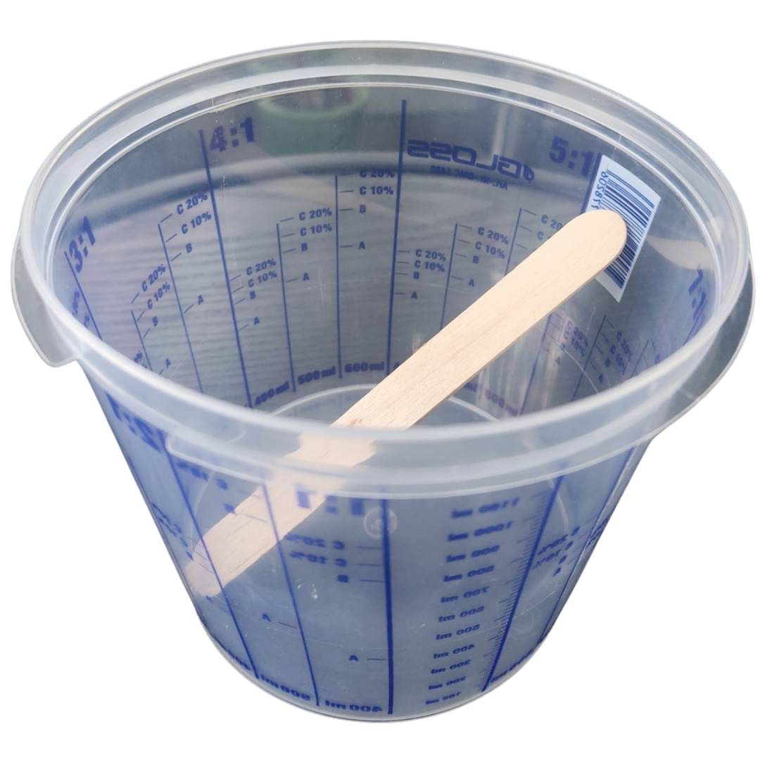 • 1 transparent PVC plastic measuring cup Ø135/Ø110 with blue markings